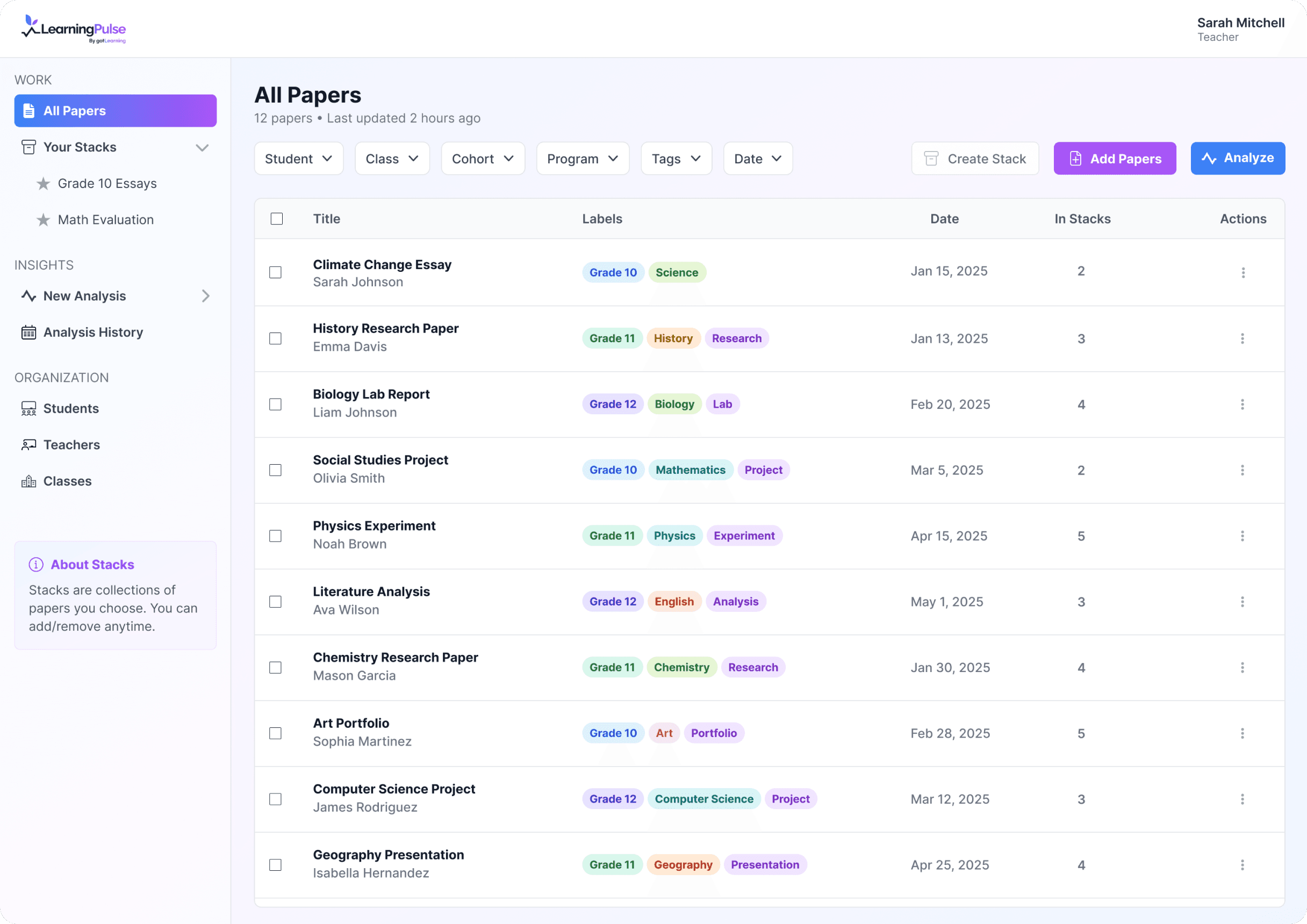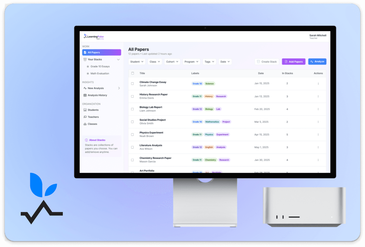 LearningPulse is a GenAI-assisted EdTech product funded by the NSF that helps educators review qualitative student work such as documents and writing samples. The platform generates structured insights to support reflection and instructional decision-making.