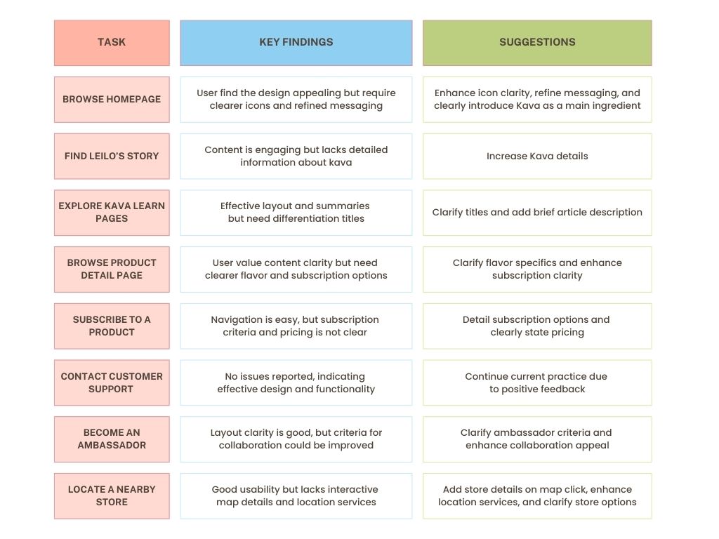 1) User Needs: Through user interviews, we learned that Leilo’s customers highly valued clear, accessible product information. Many users were unfamiliar with kava, one of Leilo’s main ingredients, and sought educational content that was simple and easy to understand. This insight prompted us to prioritize ingredient transparency and clear product descriptions in the redesign.